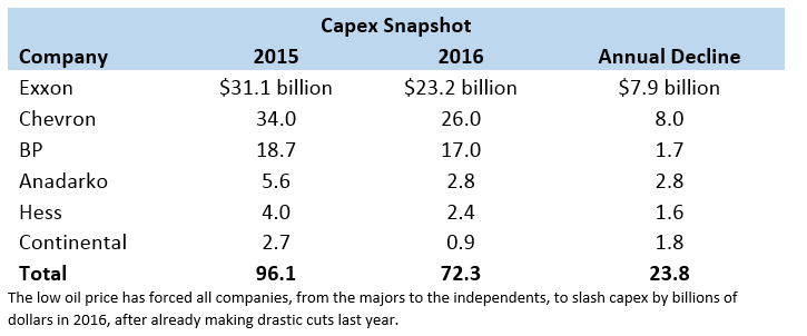 Both Exxon and Chevron will slice capex by around 25 percent this year, while BP is also scaling back. Some of the biggest U.S. independents, which have been instrumental in the shale boom, are slashing spending at even more dramatic levels.