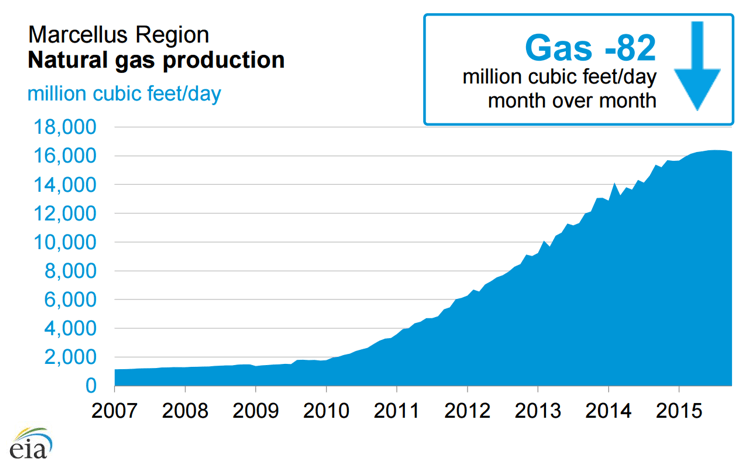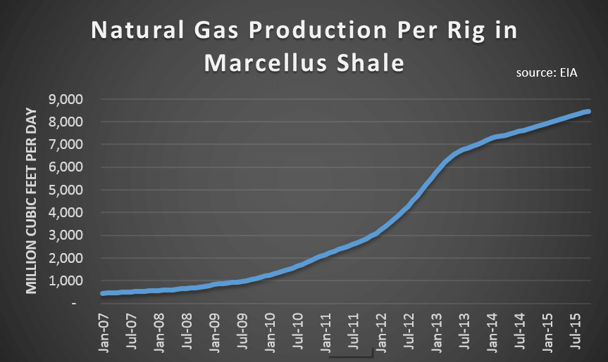 For example, in the Marcellus Shale—which stretches across Pennsylvania, Ohio, and West Virginia—natural gas production jumped from less than 4 billion cubic feet per day (bcf/d) in early 2011 to more than 16 bcf/d in 2015, a fourfold increase at a time of falling prices and a falling rig count.
